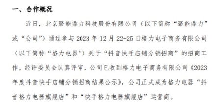 聚能鼎力近日發(fā)布公告,北京聚能鼎力科技股份有限公司(以下簡稱“聚能鼎力”或“公司”)通過參與2023年12月22-25日格力電子商務(wù)有限公司(以下簡稱“格力電器”)關(guān)于“抖音快手店鋪分銷招商”的招商工作,經(jīng)評委員會認真評審,公司已收到格力電子商務(wù)有限公司《2023年度抖音快手店鋪分銷招商結(jié)果公示》,公司正式成為格力電器“抖音格力電器旗艦店”和“快手格力電器旗艦店”運營商。