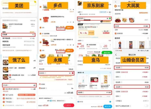 除了盒馬外,在山姆會(huì)員店、大潤發(fā)、美團(tuán)、餓了么、京東到家等主要生鮮電商、本地生活平臺上購物也需要支付包裝費(fèi)或打包費(fèi),收取的費(fèi)用為 1 至 2 元不等。