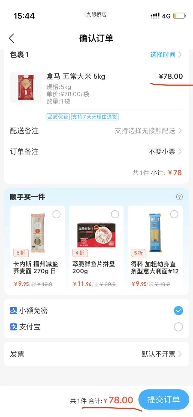 對于不少網(wǎng)友所詬病的,下單購買有獨(dú)立包裝的大米、水果、牛奶等商品仍被收取包裝費(fèi)的情況,在盒馬 app 上測試獨(dú)立下單了一袋 5kg 包裝的大米,并沒有被收取包裝費(fèi)。