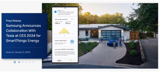 在 CES 2024 開幕之前,三星官網(wǎng)發(fā)布新聞稿,宣布與特斯拉展開智能家居合作。