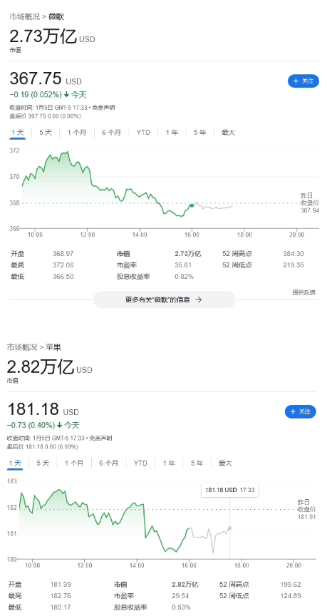 目前微軟公司市值為 2.73 萬億美元(備注:當(dāng)前約 19.57 萬億元人民幣),蘋果公司市值 2.82 萬億美元(當(dāng)前約 20.22 萬億元人民幣),兩者僅約 1000 億美元(當(dāng)前約 7170 億元人民幣)。