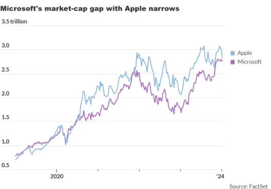自 2021 年 11 月 17 日以來,蘋果公司的市值從未低于微軟公司;是自 2021 年 11 月 22 日以來的最小差距。