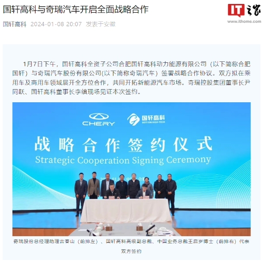 國(guó)軒高科與奇瑞開(kāi)啟全面戰(zhàn)略合作,共同開(kāi)拓新能源汽車市場(chǎng) 09:26:55