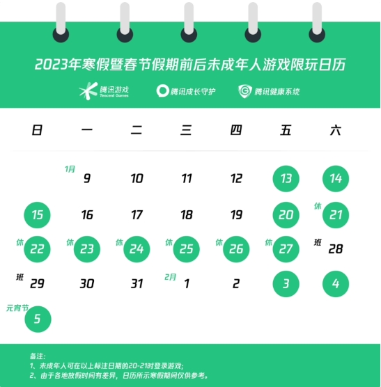 騰訊游戲公布寒假限玩日歷:未成年人假期最多可玩 16 小時 09:47:59
