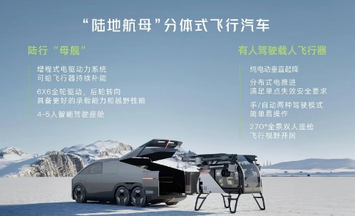 “陸地航母”由陸行體和飛行體兩部分構(gòu)成,陸行體可將飛行體完全收納至車內(nèi),進(jìn)行地面移動,并可像“變形金剛”一樣進(jìn)行自動分離、結(jié)合;采用增程式電驅(qū)動力系統(tǒng),支持 6×6 全輪驅(qū)動、后輪轉(zhuǎn)向,可承載 4-5 人。