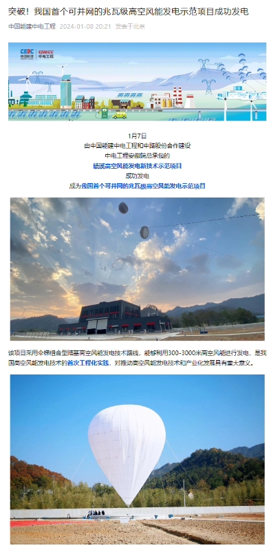 據(jù)中國電力工程顧問集團(tuán)公司官方消息,1 月 7 日,由中國能建中電工程和中路股份合作建設(shè)、中電工程安徽院總承包的“績溪高空風(fēng)能發(fā)電新技術(shù)示范項目”成功發(fā)電,成為我國首個可并網(wǎng)的兆瓦級高空風(fēng)能發(fā)電示范項目。