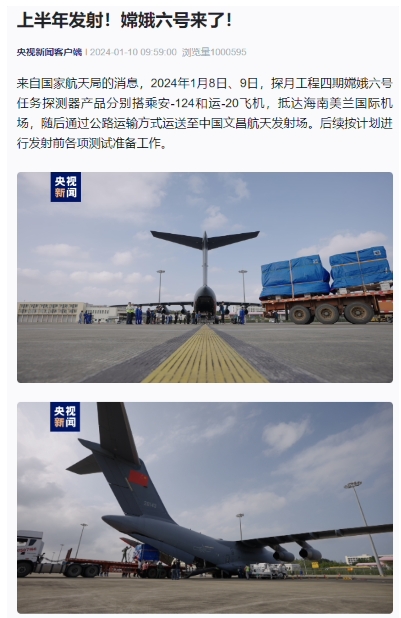 據(jù)央視報(bào)道,探月工程四期嫦娥六號(hào)任務(wù)探測(cè)器產(chǎn)品已分別搭乘安-124 和運(yùn)-20 飛機(jī)抵達(dá)海南,后續(xù)按計(jì)劃進(jìn)行發(fā)射前各項(xiàng)測(cè)試準(zhǔn)備工作。