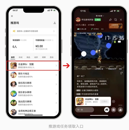 2023 年 5 月,微信“視頻號(hào)直播推游戲”功能灰度上線,游戲廠商在視頻號(hào)上架游戲推薦任務(wù),視頻號(hào)主播可在任務(wù)廣場(chǎng)領(lǐng)取任務(wù);直播游戲時(shí),主播進(jìn)入副設(shè)備直播間 / 視頻號(hào)助手 web 端,點(diǎn)擊“一起玩”即可推送已經(jīng)領(lǐng)取的游戲任務(wù),引導(dǎo)粉絲預(yù)約、下載、啟動(dòng)游戲,實(shí)現(xiàn)私域流量變現(xiàn)。