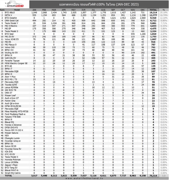 按品牌來統(tǒng)計的話,泰國 2023 電動汽車銷量排名為: