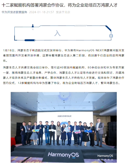 本次活動(dòng)上有 12 家機(jī)構(gòu)與華為簽署了鴻蒙人才合作協(xié)議,包括北京中軟國(guó)際教育科技股份有限公司、北京軟通動(dòng)力教育科技有限公司、北京博海迪信息科技股份有限公司、北京千鋒互聯(lián)科技有限公司、青軟創(chuàng)新科技集團(tuán)股份有限公司、濟(jì)南博賽網(wǎng)絡(luò)技術(shù)有限公司、江蘇傳智播客教育科技股份有限公司、福州市傳一卓躍職業(yè)技能培訓(xùn)學(xué)校有限公司、江蘇潤(rùn)開(kāi)鴻數(shù)字科技有限公司、深圳市訊方技術(shù)股份有限公司、達(dá)內(nèi)時(shí)代科技集團(tuán)有限公司、江西幻云信息科技有限公司。