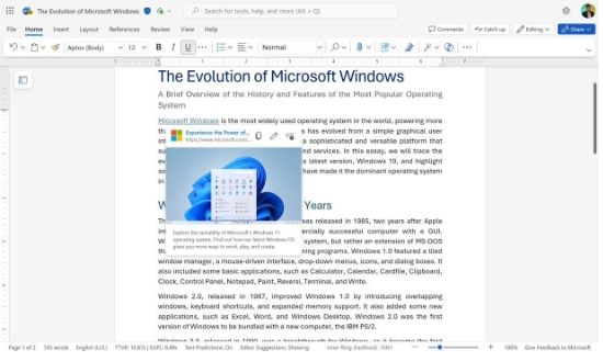 微軟近日發(fā)布新聞稿,預(yù)告網(wǎng)頁版 Word 應(yīng)用即將到來的更新,為鏈接預(yù)覽提供更豐富內(nèi)容。