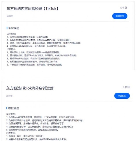 對于東方甄選而言,與 TikTok 的合作將有望為其海外業(yè)務開拓帶來新的機遇。商務經(jīng)理(TikTok)一職的設立表明了公司在海外市場上對供應鏈管理和采購策略的重視,預示著未來可能有更多的合作和拓展計劃。