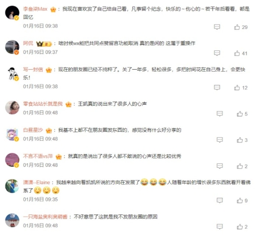 但隨著微信好友數(shù)量從一二十個,增長到一兩千個時,這個列表里絕大部分人其實(shí)并不是自己的“朋友”,朋友圈也就變得越來越混沌、復(fù)雜,變得更具功利屬性的一種社交工具了,所以王凱選擇抽身而去,不再發(fā)布,也不再關(guān)注。這也得到了許多網(wǎng)友的認(rèn)可與共情。