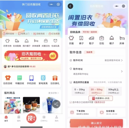 通過(guò)小程序可以填寫(xiě)個(gè)人信息以及上門(mén)回收時(shí)間,平臺(tái)會(huì)根據(jù)預(yù)約時(shí)間安排回收員免費(fèi)上門(mén)回收舊衣物。
