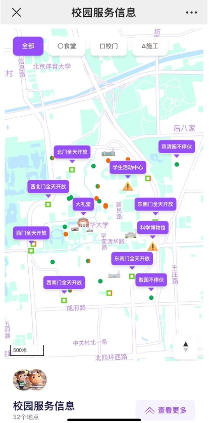 社會(huì)公眾入校前后可在清華大學(xué)官方網(wǎng)站下載使用校園地圖,按照地圖上的圖示指引,規(guī)劃游學(xué)路線。此外,“清華后勤”企業(yè)號底部菜單欄“服務(wù)平臺(tái)”頻道嵌入【行在清華】板塊,新增【服務(wù)地圖】欄目,校園服務(wù)信息可以一鍵獲得。
