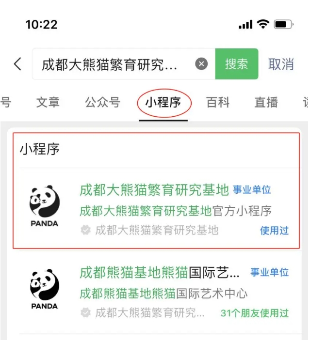 打開官方小程序有以下兩種方式:點(diǎn)開微信右上角的“掃一掃”,掃碼小程序二維碼進(jìn)入;點(diǎn)開微信主頁上方的“搜索”,輸入“成都大熊貓繁育研究基地”“熊貓基地”選擇小程序進(jìn)入。
