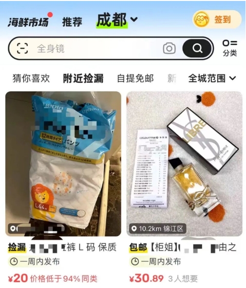 可見原本閑魚近場(chǎng)交易的屬性本就較強(qiáng)。據(jù)《新立場(chǎng)》觀察,閑魚 APP 不僅有本地推薦頁(yè)模塊,該模塊內(nèi)還有細(xì)分的“附近撿漏”、“自提免郵”等模塊,點(diǎn)擊進(jìn)入“附近撿漏”模塊,可以刷到附近 5 公里 10 公里等范圍內(nèi)的閑置商品,但其不會(huì)顯示具體社區(qū)名字的定位。