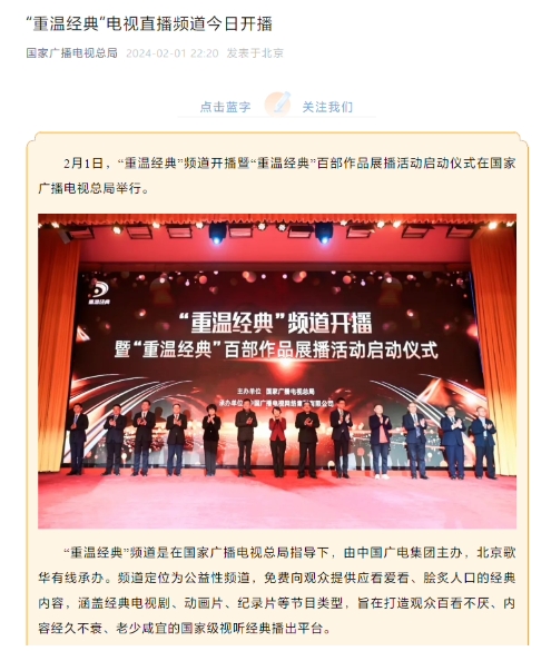 據(jù)國家廣播電視總局官方公眾號,“重溫經(jīng)典”頻道開播暨“重溫經(jīng)典”百部作品展播活動啟動儀式,于今日在國家廣播電視總局舉行。