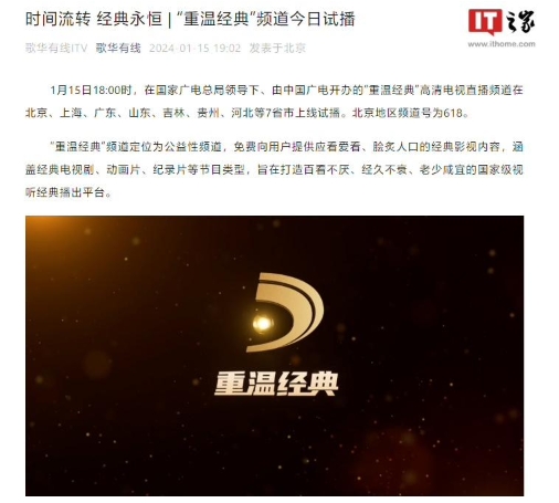 “重溫經(jīng)典”頻道于 1 月 15 日在北京、上海、廣東、山東、吉林、貴州、河北等 7 省市上線試播,北京地區(qū)頻道號為 618。