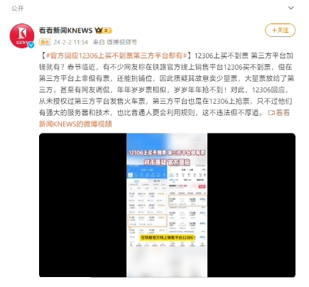 據(jù)上海廣播電視臺(tái)“看看新聞”報(bào)道,臨近春節(jié),近日不少網(wǎng)友稱在鐵路官方線上銷售平臺(tái) 12306 買不到票,在第三方平臺(tái)上不僅有票,還能挑鋪位,因此質(zhì)疑鐵路 12306“故意賣少量票”,并將大量車票放給第三方(平臺(tái))。