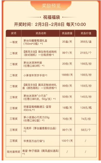 根據(jù)活動(dòng)規(guī)定,每位用戶每天可不限次數(shù)送出祝福,但福袋每日限量派送,單個(gè)用戶每天最多可獲得3個(gè)福袋,活動(dòng)期間累計(jì)最多可獲得18個(gè)福袋。2月3日-2月8日,每天10點(diǎn),用戶可開啟前一日拿到的“祝福”福袋,并參與開獎(jiǎng),每個(gè)福袋均可獲得小獎(jiǎng)品,包括巽風(fēng)app中的基酒寶箱、巽風(fēng)文創(chuàng)產(chǎn)品、悠蜜藍(lán)莓精釀、茅臺(tái)冰淇淋、茅小凌酒心巧克力等。
