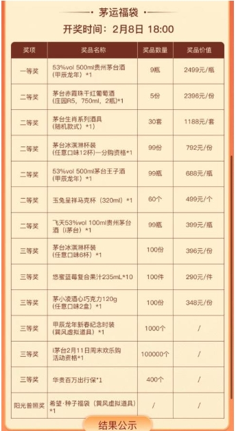 2月8日18時(shí),擁有“祝福”福袋的用戶可參與“茅運(yùn)”福袋開獎(jiǎng),有機(jī)會(huì)獲得大獎(jiǎng),包括貴州茅臺(tái)酒(甲辰龍年)系列酒、悠蜜藍(lán)莓復(fù)合果汁、茅臺(tái)生肖系列酒具等。