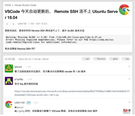 日前有網(wǎng)友發(fā)帖詢問,在安裝了 VS Code 自動(dòng)更新后,遠(yuǎn)程開發(fā)服務(wù)器 Remote SSH 連不上 Ubuntu Server 18.04,評(píng)論區(qū)指出這是由于 Ubuntu 18.04 LTS 等舊版本 Linux 發(fā)行版使用 glibc 2.27,因此在更新 VS Code 1.86 后便無法連上。