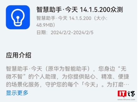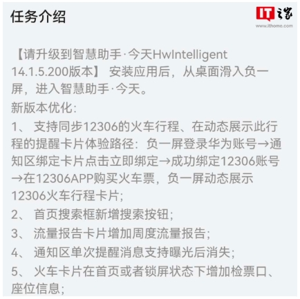 華為昨天為智慧助手推送了 14.1.5.200 眾測更新,包體積為 48.9MB,主要改進(jìn)了 12306 火車信息同步功能。