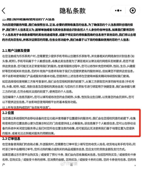 在樂(lè)樂(lè)茶小程序的隱私條款中提及,“會(huì)在授權(quán)同意的前提下,收集和使用位置信息以便展示附近門(mén)店或提供線上點(diǎn)餐服務(wù)。如果消費(fèi)者關(guān)閉定位服務(wù)停止樂(lè)樂(lè)茶對(duì)消費(fèi)者所在位置信息的收集,可能因此無(wú)法使用樂(lè)樂(lè)茶基于地址位置提供的服務(wù),或者無(wú)法達(dá)到相關(guān)服務(wù)的預(yù)期效果。”