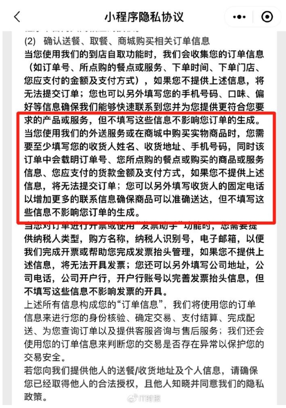 關(guān)于外送服務(wù),隱私協(xié)議中表示,需要至少填寫(xiě)收貨人姓名、收貨地址、手機(jī)號(hào)碼。對(duì)于位置信息,協(xié)議中強(qiáng)調(diào),“我們會(huì)收集您的位置信息來(lái)判斷您所處的位置,以自動(dòng)展示您所在區(qū)域可以享受的服務(wù),但不會(huì)判斷您的行蹤軌跡。如果關(guān)閉位置權(quán)限,您可能無(wú)法使用基于位置信息為您提供的服務(wù),或者無(wú)法達(dá)到相關(guān)服務(wù)的預(yù)期效果。”但不填寫(xiě)這些信息,并不影響訂單的生成。