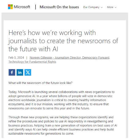 通過這次官宣的項目,微軟將幫助新聞機(jī)構(gòu)識別、完善使用 AI 進(jìn)行新聞采編、業(yè)務(wù)實踐的程序及政策,并輔助培訓(xùn)新一代記者:指導(dǎo)其如何“最佳”利用 AI,并尋找 AI 輔助完成高效業(yè)務(wù)的方式,“造福后代”。