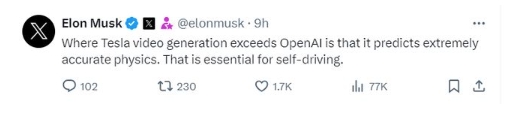 在一條回復用戶的評論中馬斯克指出,“特斯拉視頻生成超越OpenAI的地方在于,它預測了極其精準的物理場景,這對自動駕駛至關(guān)重要。”