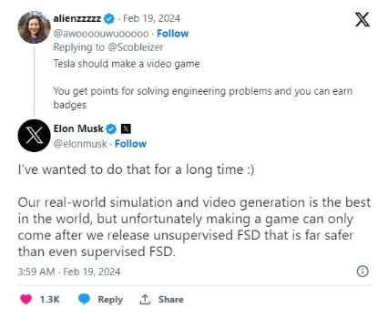 另有一位用戶發(fā)帖稱,“特斯拉應(yīng)該做一款電子游戲”,這位首席執(zhí)行官回應(yīng)道,他想做這件事已經(jīng)很久了,他認為特斯拉的“真實世界模擬和視頻生成是世界上最好的”。