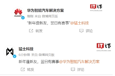 華為智能汽車解決方案、東風(fēng)猛士科技今日共同發(fā)布預(yù)熱微博:“新年逢新友,翌日有喜事”(翌日指明日)。