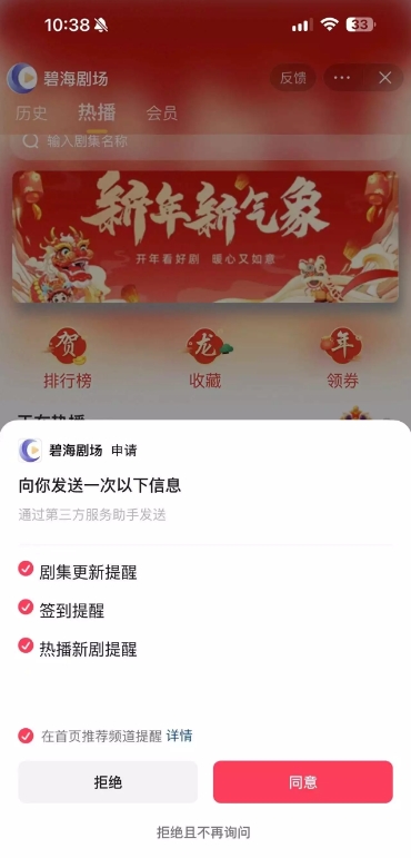 抖音短劇小程序向用戶申請(qǐng)更多「通知信息」權(quán)限。