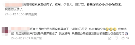 有網(wǎng)友表示,“被拉黑、僅聊天、刪好友,都是短橫線”“朋友圈全都屏蔽僅限自己可見,也會有這個線”“拉黑和僅聊天是短線,長期不發(fā)朋友圈是長線”。
