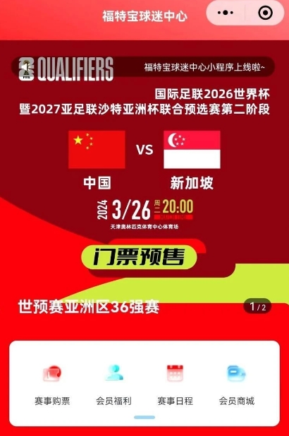 世界杯預(yù)選賽亞洲區(qū)36強(qiáng)賽中國(guó)隊(duì)主場(chǎng)對(duì)陣新加坡隊(duì)的比賽將于3月26日在天津奧林匹克體育中心體育場(chǎng)舉行,“福特寶球迷中心”小程序現(xiàn)已開放球迷方陣實(shí)名購(gòu)票預(yù)約,為龍之隊(duì)球迷會(huì)北看臺(tái)助威方陣和長(zhǎng)城球迷會(huì)南看臺(tái)助威方陣優(yōu)先開通預(yù)約服務(wù)。