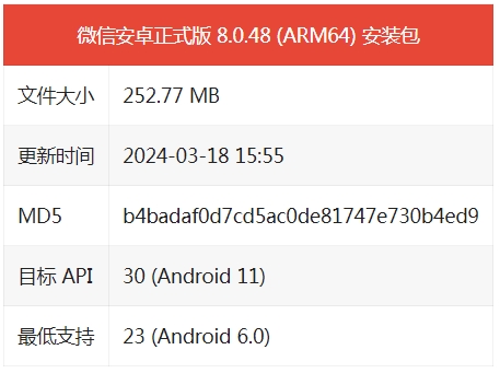 微信安卓平臺(tái)迎來(lái)了 8.0.48 正式版更新,本次更新安裝包文件詳細(xì)信息如下: