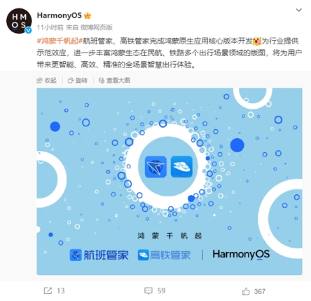 華為鴻蒙OS官微宣布,航班管家、高鐵管家完成鴻蒙原生應(yīng)用核心版本開發(fā)。