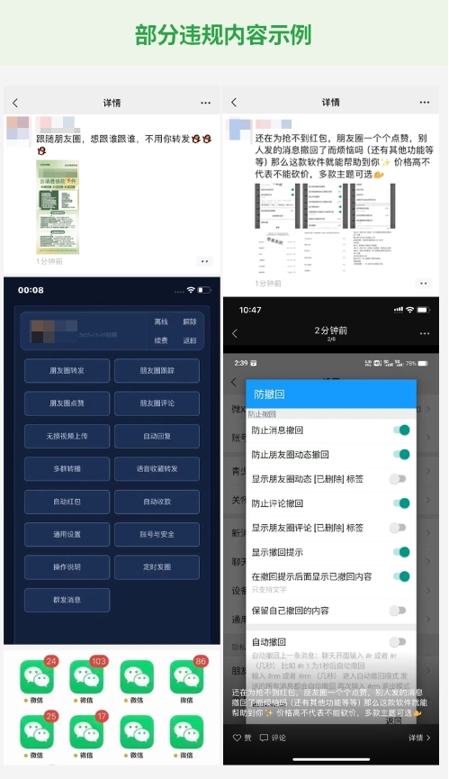 公告稱,用戶在使用微信軟件的過程中不得進行影響用戶體驗、侵犯騰訊知識產(chǎn)權、危及平臺安全、損害他人權益的行為。根據(jù)《微信個人賬號使用規(guī)范》規(guī)定,微信明確禁止使用各類外掛。但近期發(fā)現(xiàn),有部分用戶存在多次違規(guī)使用外掛軟件,或在朋友圈發(fā)布外掛售賣信息的行為。對此,微信安全團隊進行了專項清理,并將持續(xù)加大清理力度。
