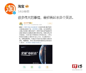 箭元科技近日宣布與淘寶開展火箭試驗,未來有望全球范圍內(nèi)“小時達(dá)”,引發(fā)網(wǎng)友熱議。面對質(zhì)疑,淘寶官方回應(yīng)稱:“很多偉大的事情,最初看起來是個笑話”。