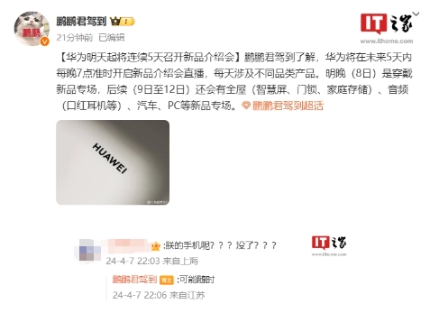 明晚(8 日)是穿戴新品專場,后續(xù)(9 日至 12 日)還會有全屋(智慧屏、門鎖、家庭存儲)、音頻(口紅耳機(jī)等)、汽車、PC 等新品專場。至于華為 P70 系列何時登場,該博主并未透露,只是表示“可能隨時”。