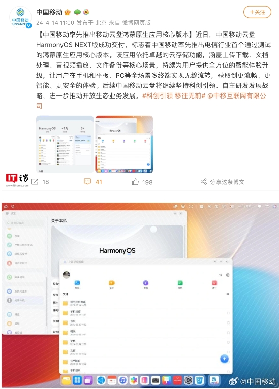 據(jù)“中國(guó)移動(dòng)”官方微博,中國(guó)移動(dòng)近日推出華為鴻蒙 HarmonyOS NEXT 版“移動(dòng)云盤(pán)” 原生 App,標(biāo)志著“中國(guó)移動(dòng)率先推出電信行業(yè)首個(gè)通過(guò)測(cè)試的鴻蒙原生應(yīng)用核心版本”。