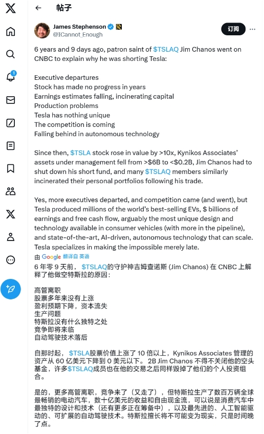 馬斯克回應的這則推文,提到了 6 年前大空頭查諾斯做空特斯拉的原因,包括行政人員離職、股票多年無進展、盈利預期下降以及產量問題、缺少獨特之處等方面。