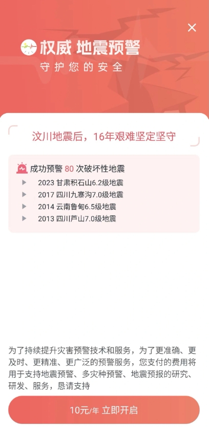 這款應(yīng)用 iOS 版本在今年 2 月便開(kāi)啟了內(nèi)購(gòu)收費(fèi),訂閱價(jià)格同樣為每年 10 元,此前針對(duì)“地震預(yù)警 App iOS 版收費(fèi)”的問(wèn)題,成都高新減災(zāi)研究所相關(guān)人員聲稱(chēng)“收費(fèi)是因?yàn)槲覀兣c蘋(píng)果達(dá)成了相關(guān)協(xié)議”。