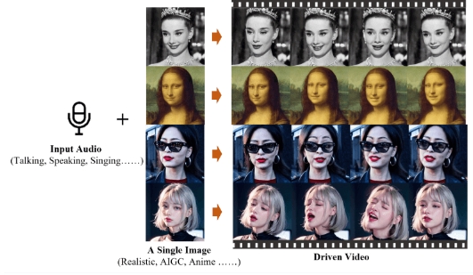 音頻驅動的視頻生成:EMO 能夠根據輸入的音頻(如說話或唱歌)直接生成視頻,無需依賴于預先錄制的視頻片段或 3D 面部模型。