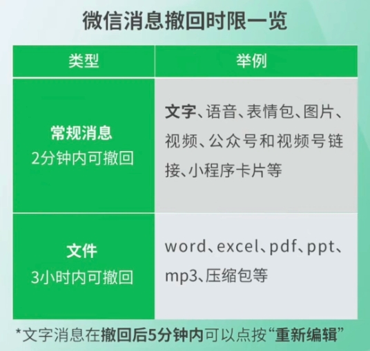 包括文字、語(yǔ)音、圖片、表情包、視頻公眾號(hào)、視頻號(hào)鏈接、小程序內(nèi)容均可在 2 分鐘內(nèi)撤回,其中文字消息可以在撤回 5 分鐘內(nèi)重新編輯,避免大家重新打字;包含 Word、Excel、PDF、PPT、MP3、壓縮包等文件 3 小時(shí)內(nèi)可以撤回。