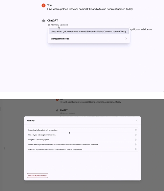 ChatGPT 的記憶能力將會(huì)隨著使用次數(shù)的增加而逐漸提升,OpenAI 總結(jié)了如下場(chǎng)景,附上示例如下: