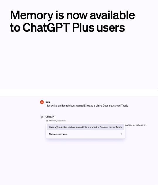 OpenAI 公司今天宣布,面向所有 ChatGPT Plus 用戶開(kāi)放“記憶”(Memory)功能,可以讓 ChatGPT 記住用戶在聊天中討論過(guò)的事情,并避免重復(fù)信息。