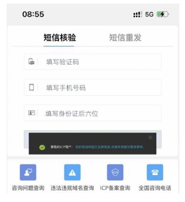 7、騰訊初審通過,法人會收到一個工信部的短信,里面有一個鏈接,點擊鏈接進入頁面頂部勾選“小程序”,填寫手機號、驗證碼和身份證后六位數(shù),提交就可以。